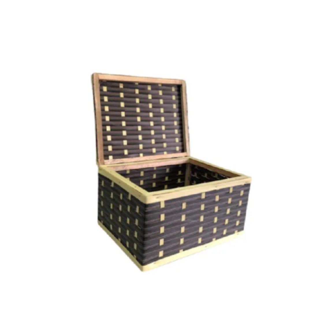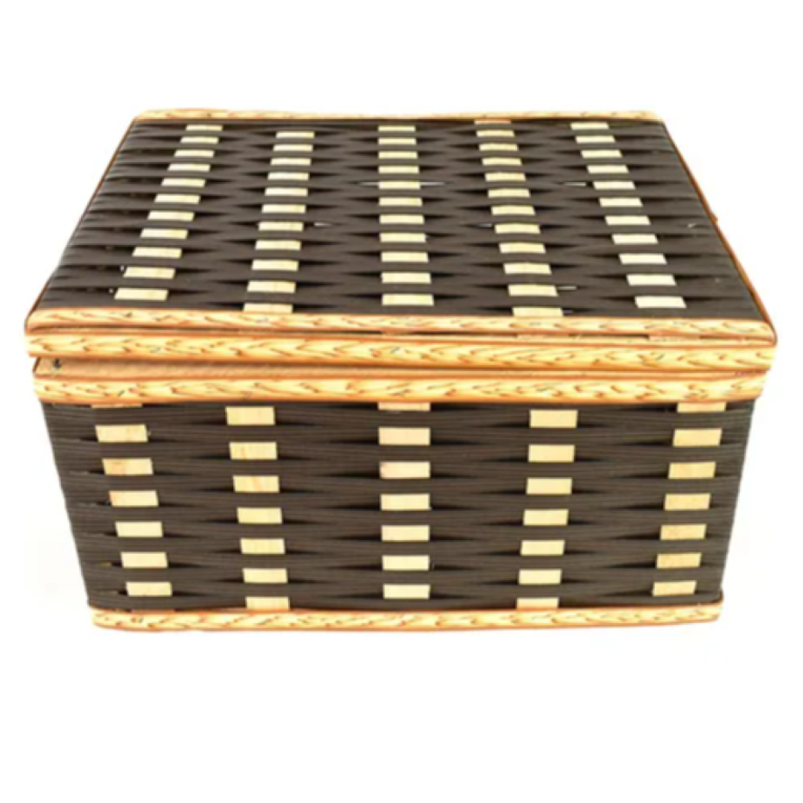 Fabricado em material sintético trançado, possui tampa articulada e alça, facilitando o manuseio e transporte. Pode ser decorado com laços, etiquetas ou tags para datas comemorativas.